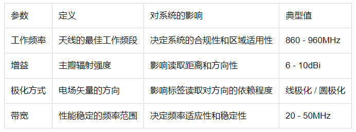 UHF RFID 天线的性能由多个技术参数决定。了解这些参数及其相互关系,对于天线选型和系统设计至关重要。